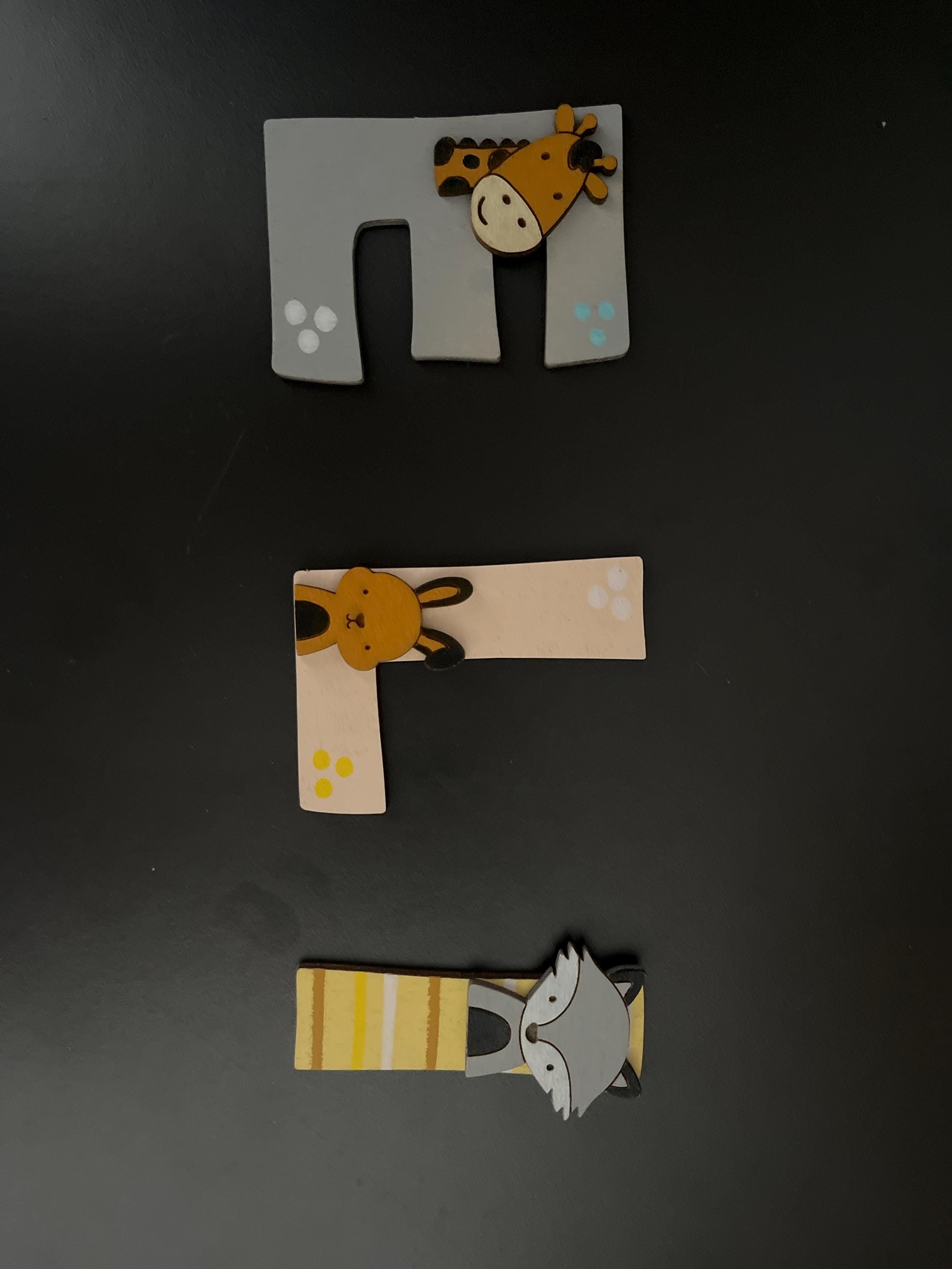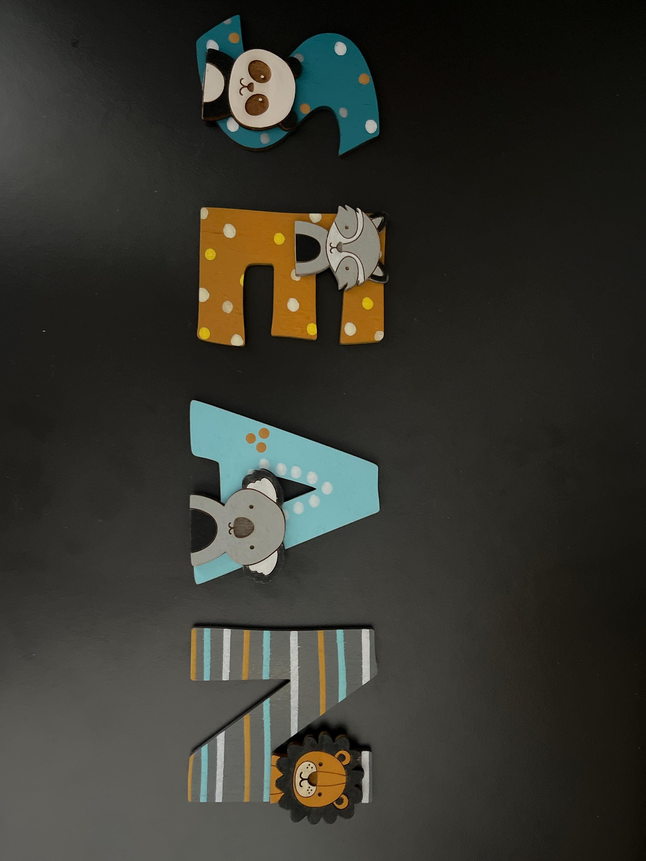 We'll make these cute wooden letters for your personalized name—featuring jungle and/or forest animals! ❤️ The letters shown are in light gray, ochre, and dark green, but you're welcome to share other color preferences.